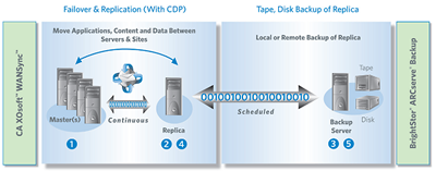 CA 아크서브 백업(CA ARCserve Backup)과 CA XO소프트 WANsync (CA XOsoft WANsync) 애플리케이션 가용성 솔루션의 결합은 백업 윈도우(백업을 위한 시간)의 제거와 포인트 백업의 통합과 같은 중요 이점을 제공해준다. CA는 복구 관리의 단일화된 플랫폼 정책을 통해 RTO 및 RPO 기준이 요구하는 솔루션을 제공한다.